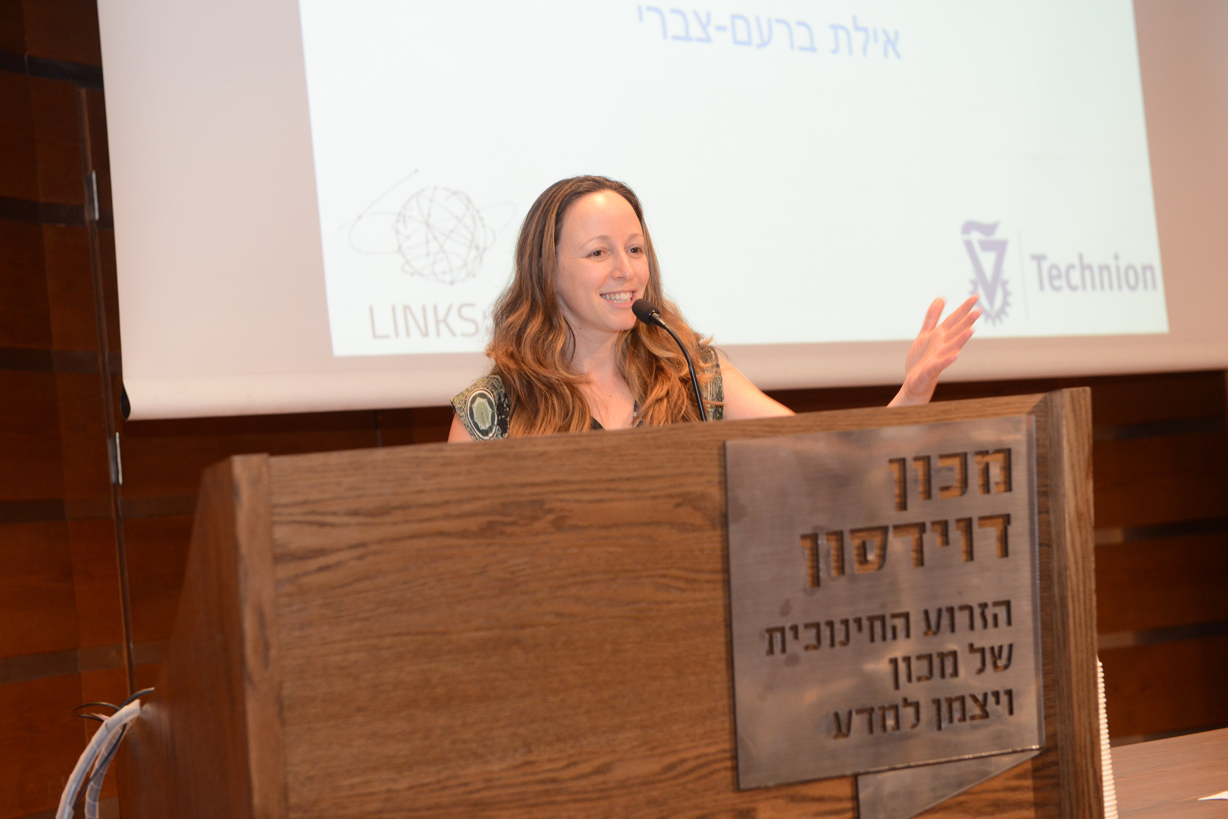 Another shot of Ayelet smiling behind lectern